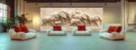| A detailed carving of elephants walking in a line on a textured surface. |
