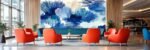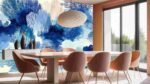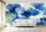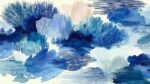 A vibrant composition of various blue shades with textured strokes and soft shapes.