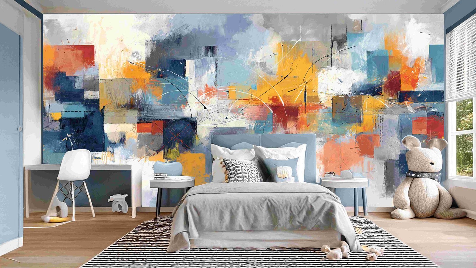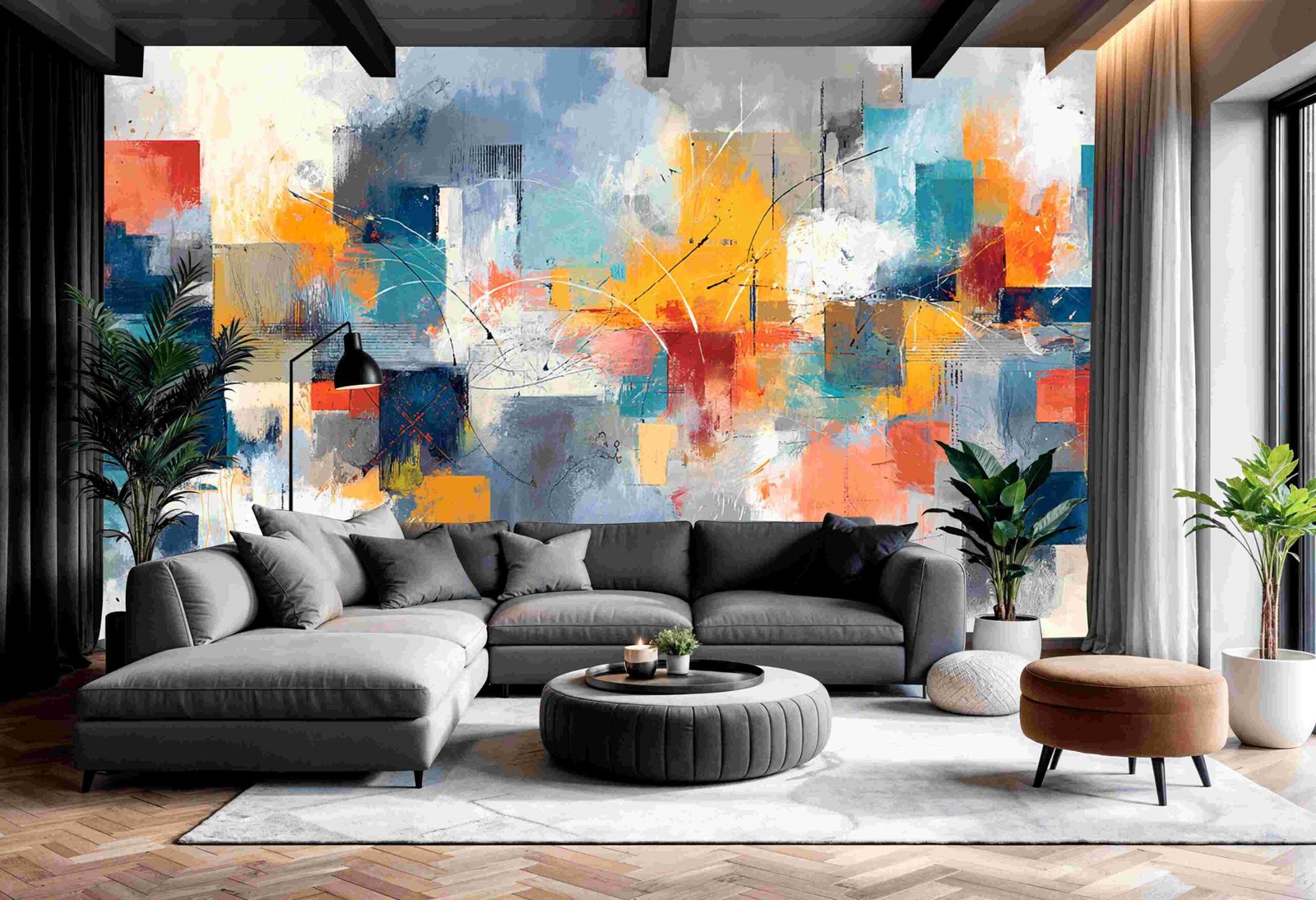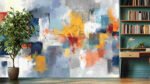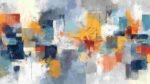 A vibrant abstract painting featuring various colored squares and rectangles in shades of blue, orange, red, and yellow.