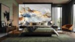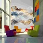 Colorful, translucent waves in shades of blue, brown, and gold, creating a dynamic visual effect.