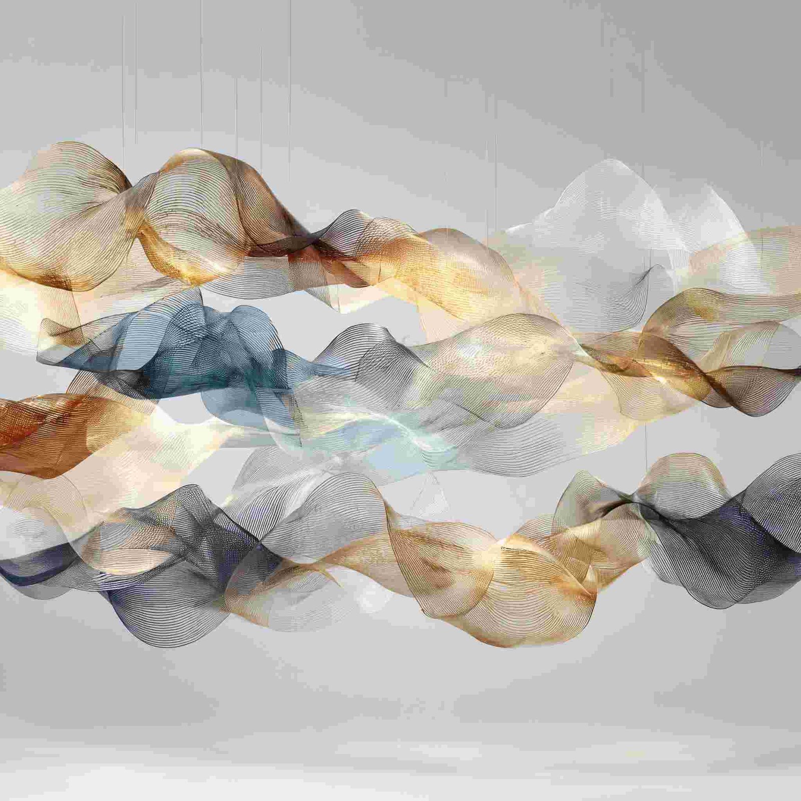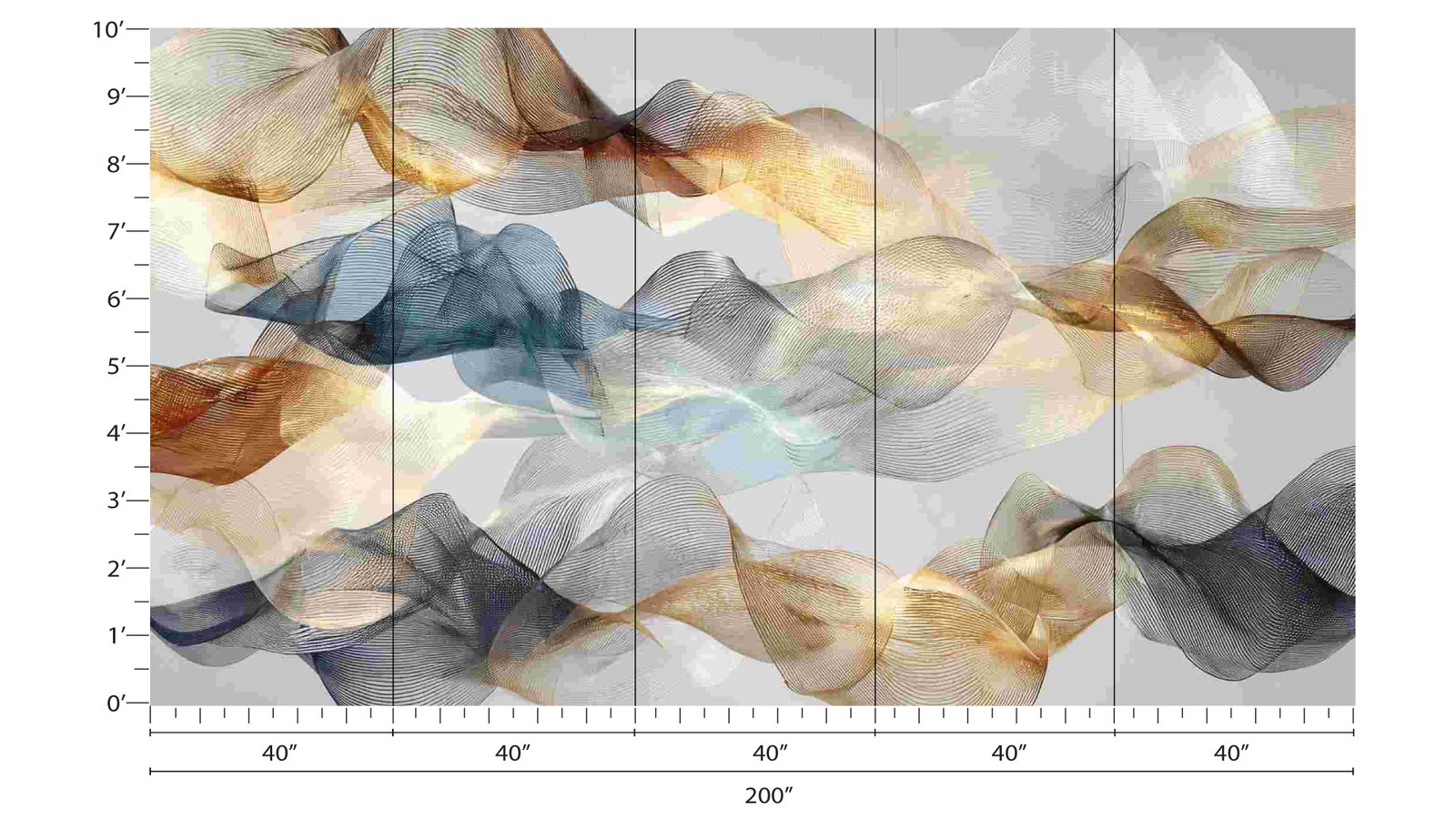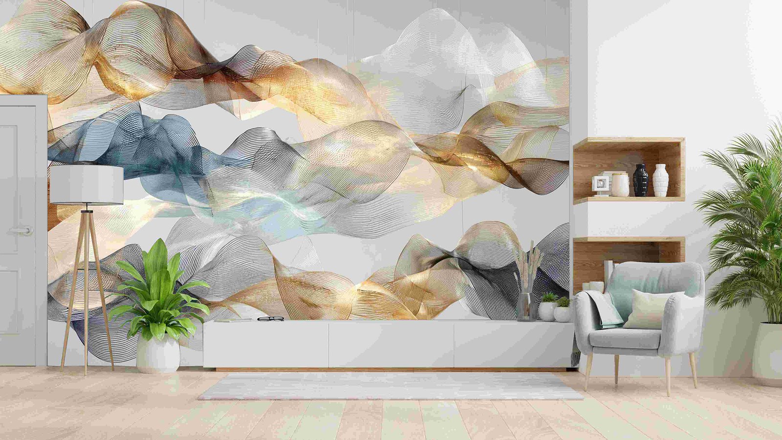 Colorful, translucent waves in shades of blue, brown, and gold, creating a dynamic visual effect.