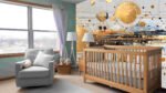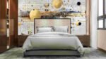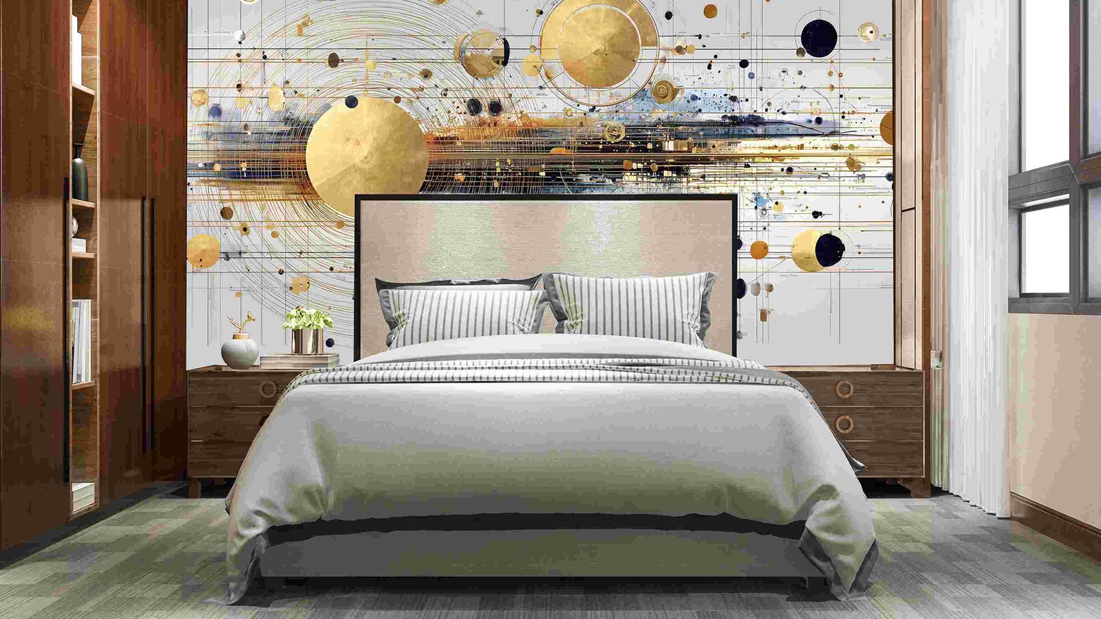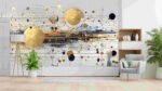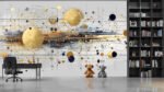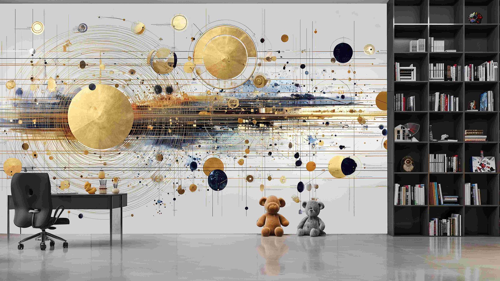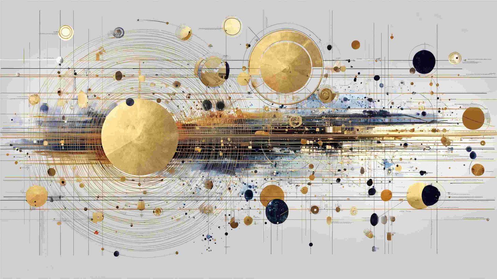 A composition of golden and dark circles with lines and splashes of color on a light background.