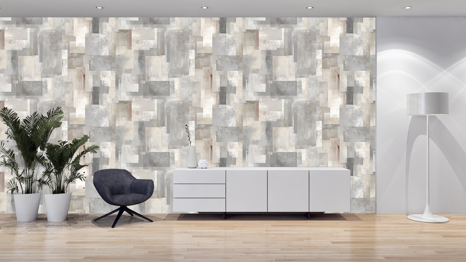 A textured design featuring various shades of gray and beige in a patchwork style.