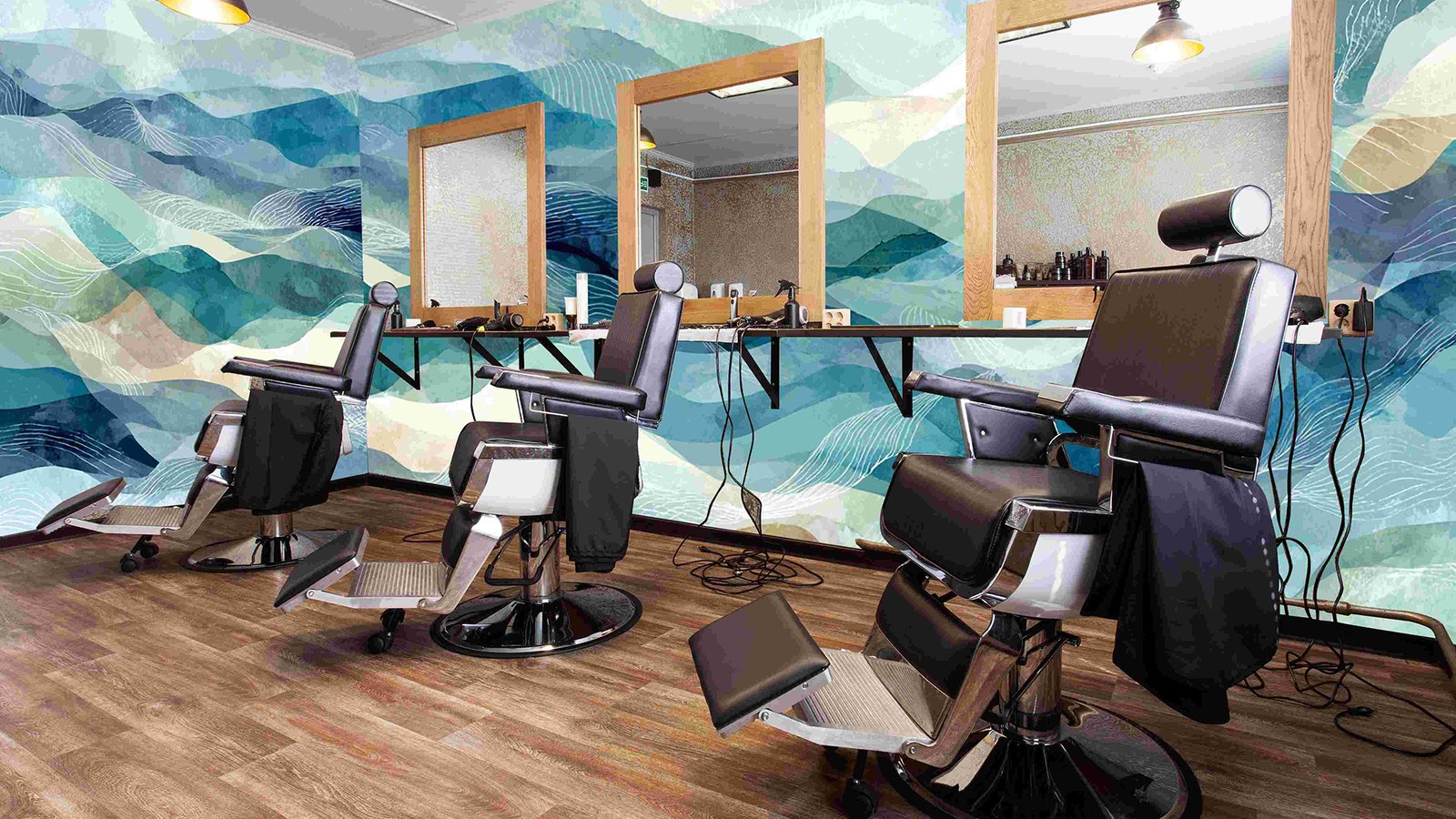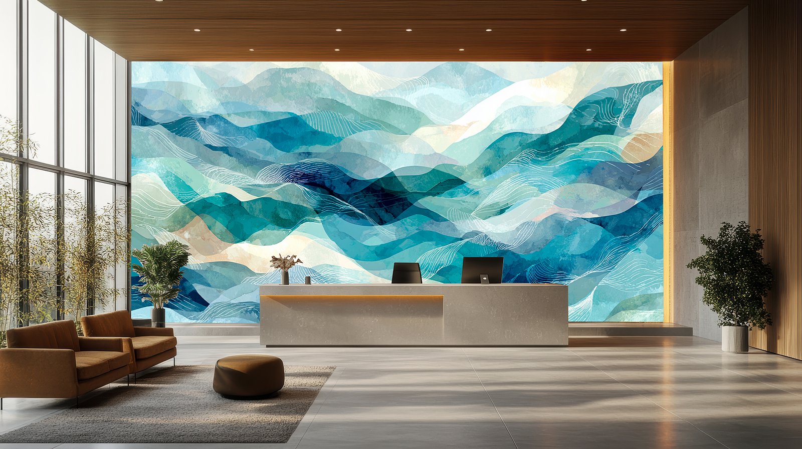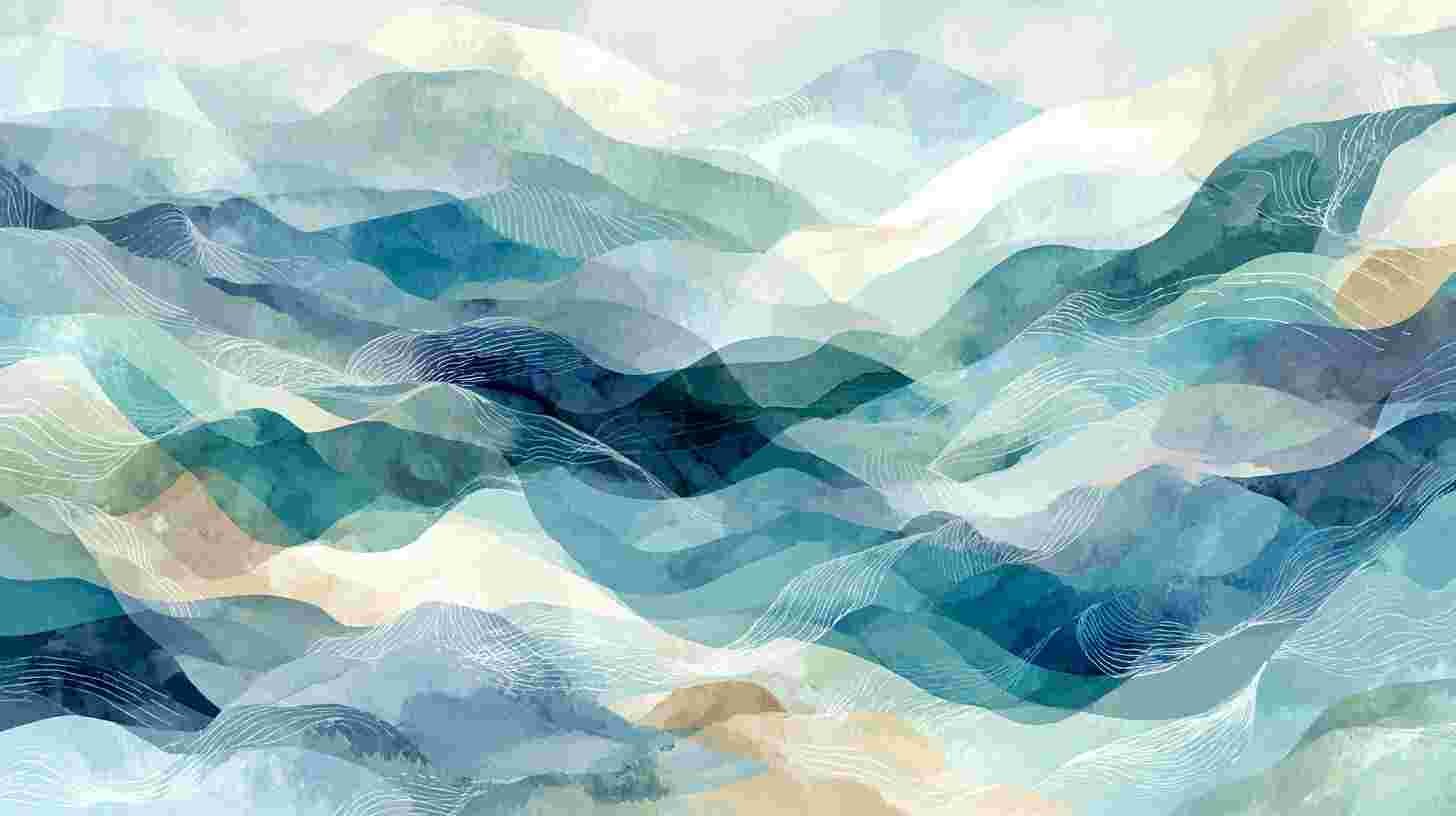 Colorful layered waves in shades of blue, green, and beige with white line patterns.