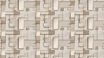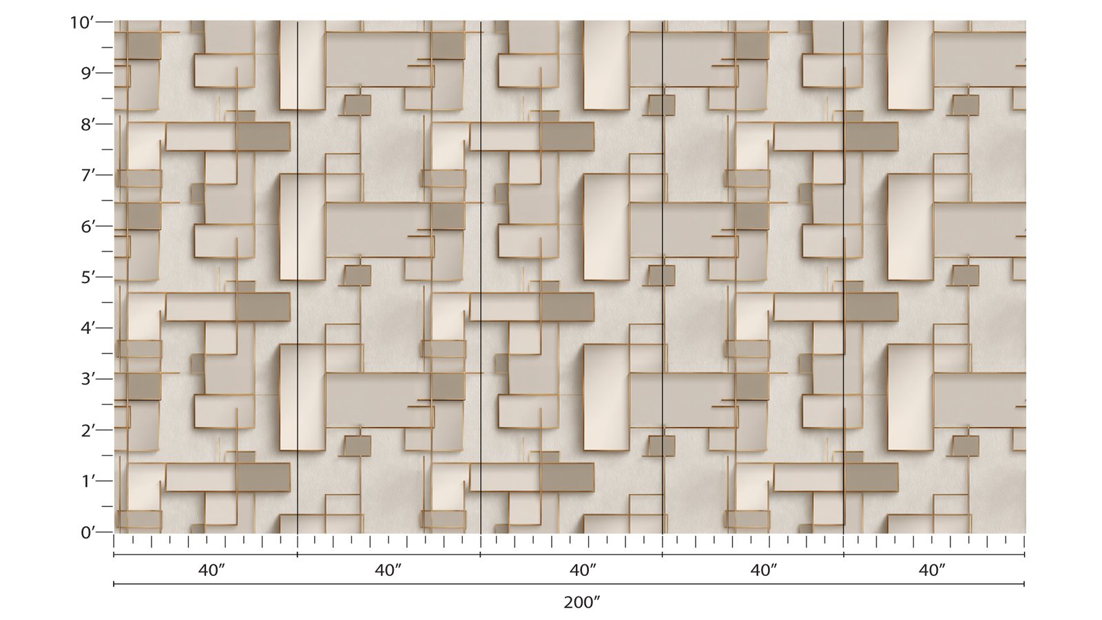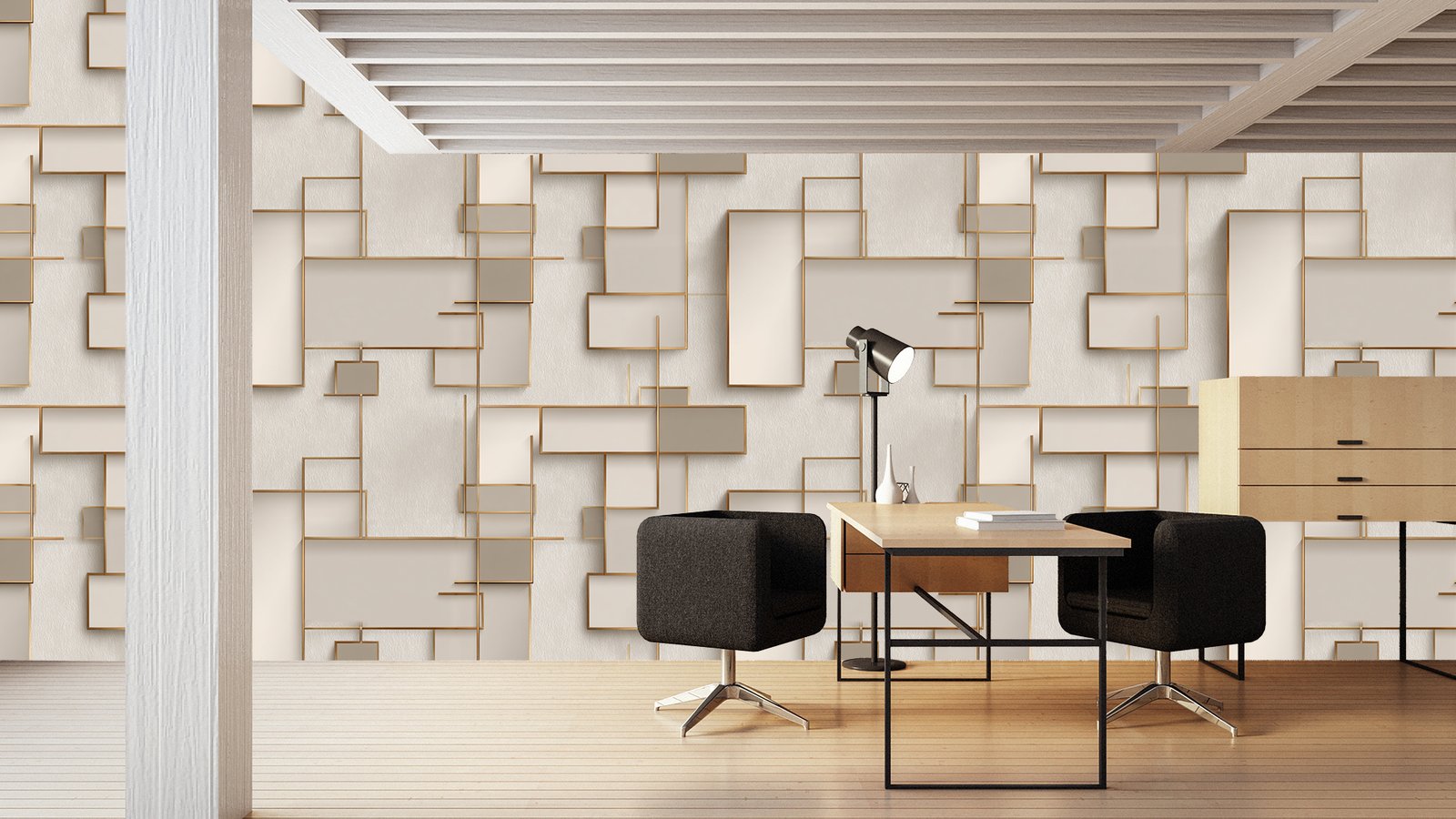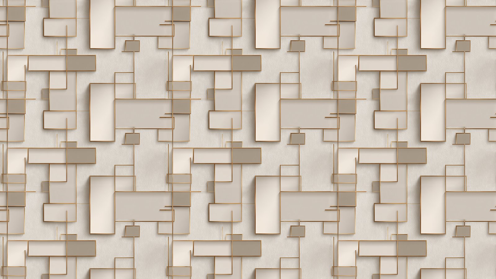 Geometric shapes in neutral tones with gold accents create a modern decorative wall design.