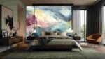 Colorful abstract design featuring flowing waves in blue, pink, and gold tones.
