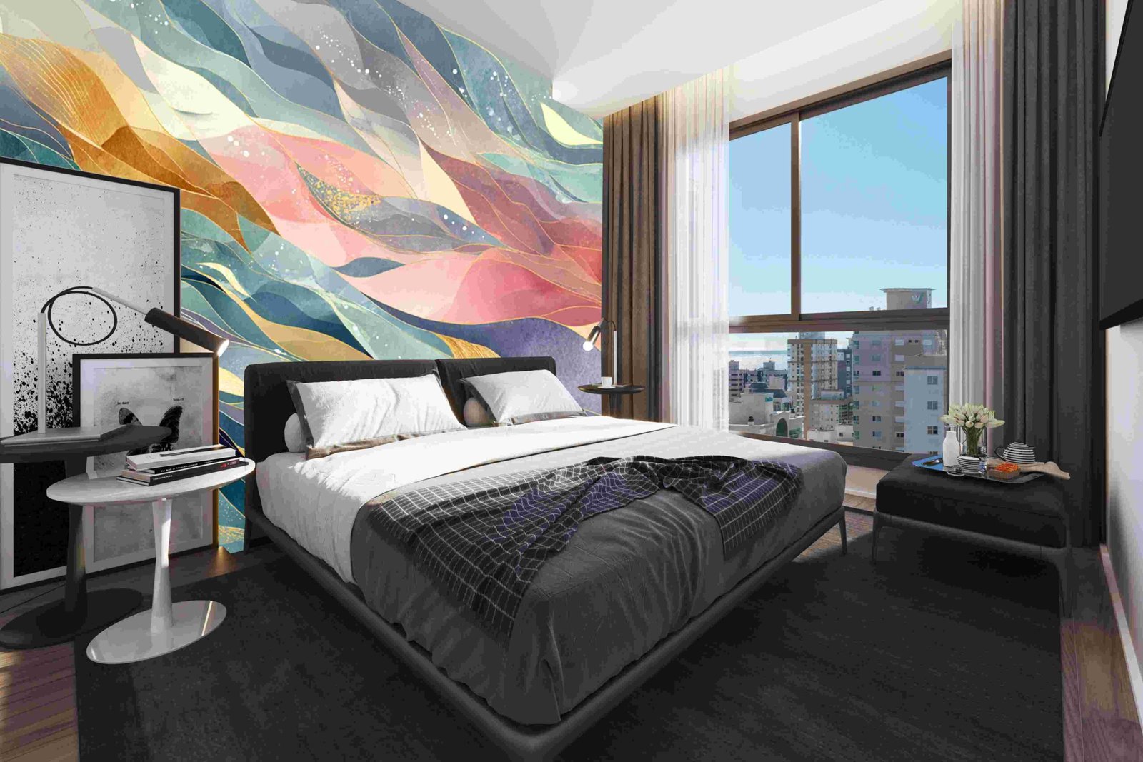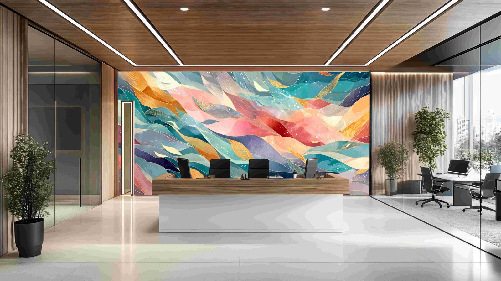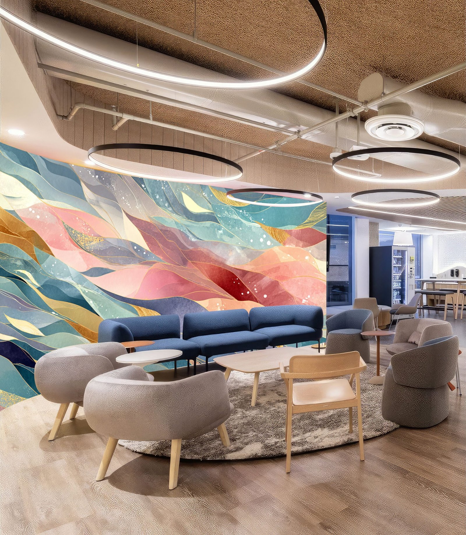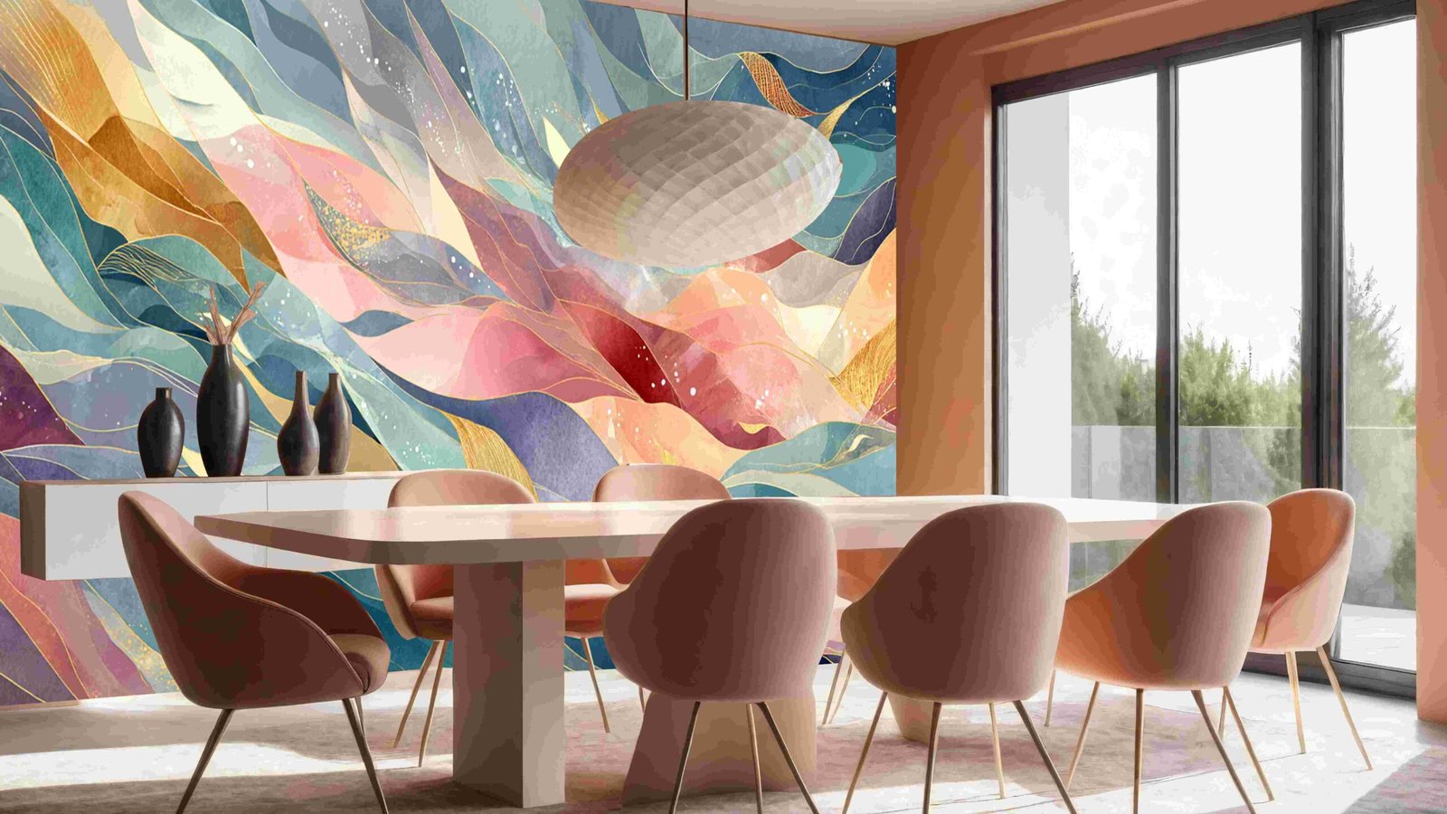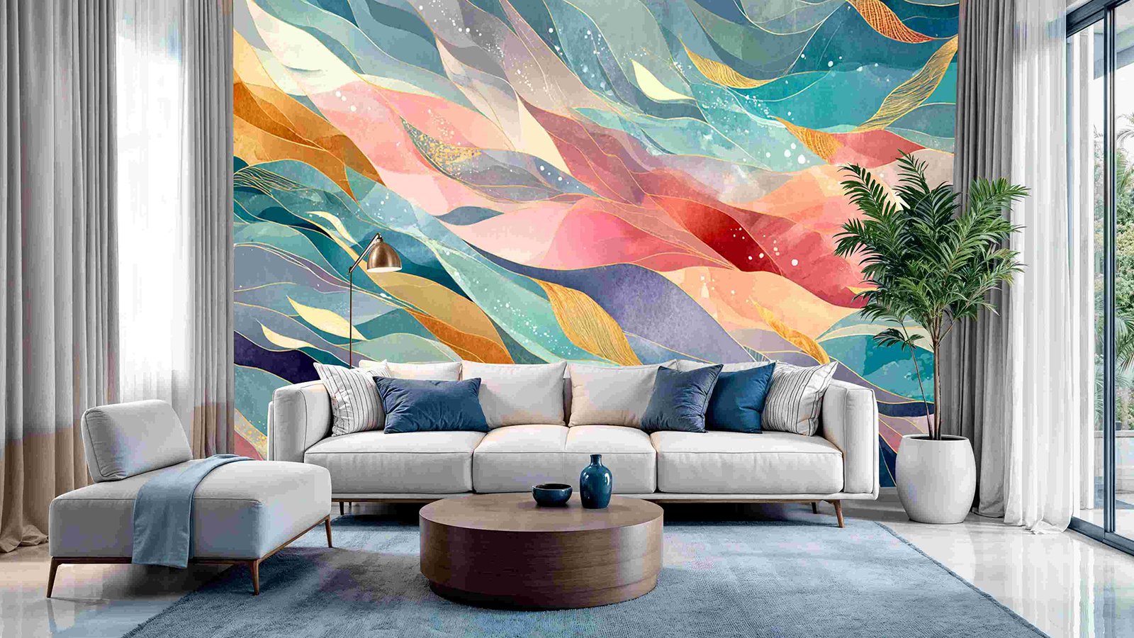 A vibrant abstract design featuring flowing waves in shades of blue, pink, gold, and purple.