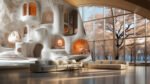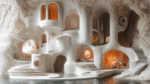 A unique, sculptural interior with curved walls, steps, and warm lighting, set against a natural stone backdrop.