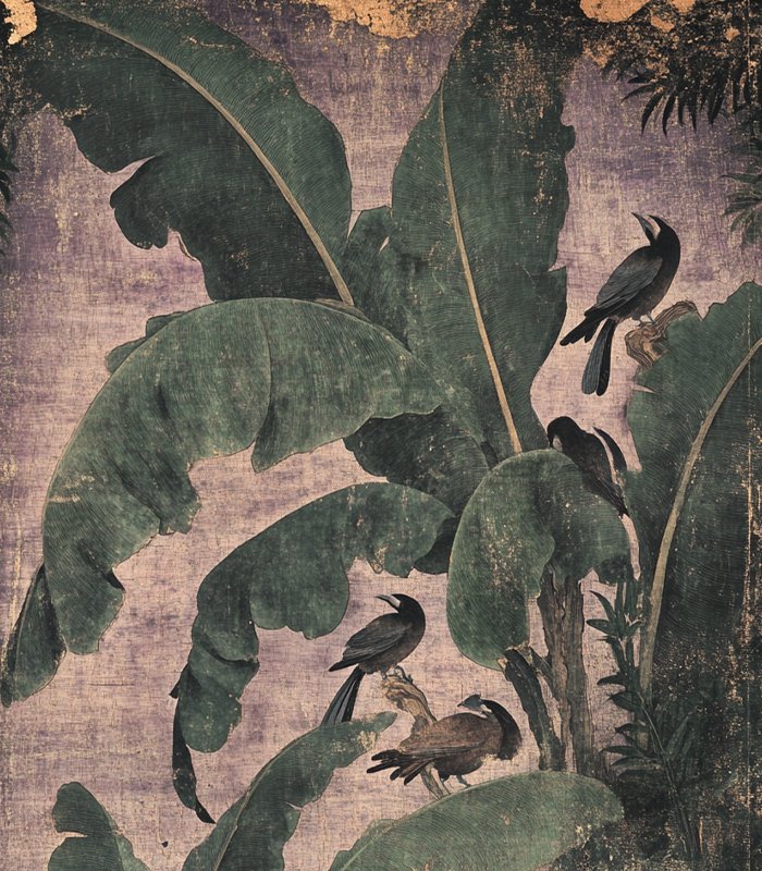 Three birds in flight above large, textured leaves on a dark, distressed background, conveying a serene yet aged appearance in a traditional Asian art style.