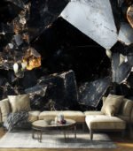 Close-up of a cluster of black and golden crystals, showcasing a striking contrast between the deep, dark hues and the vibrant, translucent amber crystals.