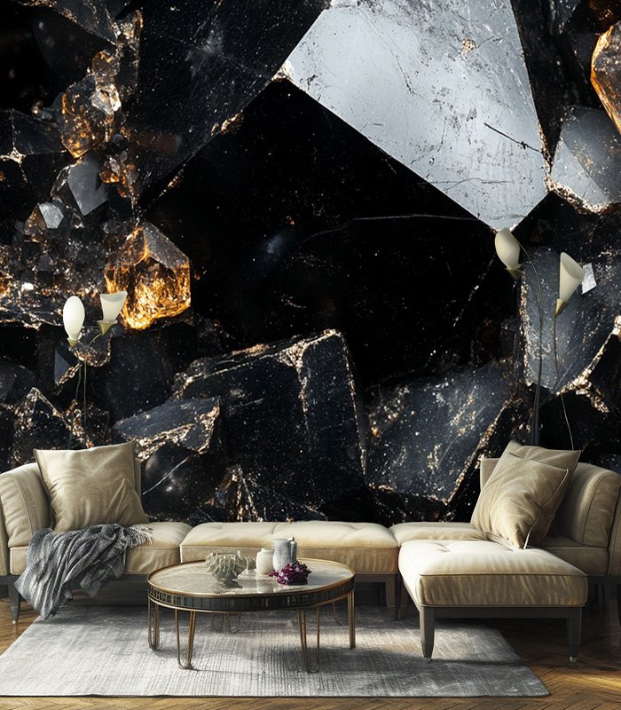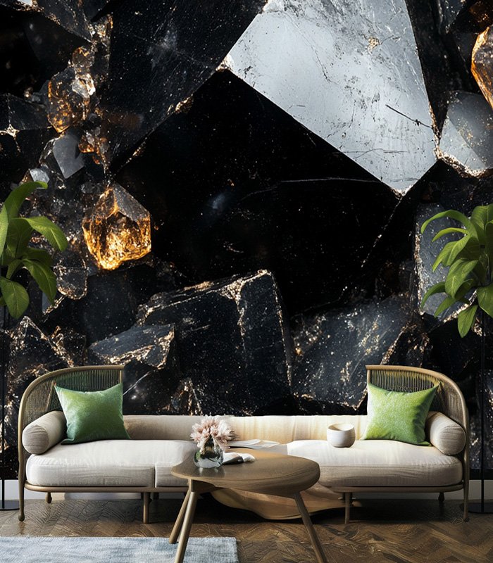 Close-up of a cluster of black and golden crystals, showcasing a striking contrast between the deep, dark hues and the vibrant, translucent amber crystals.