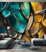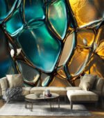 Close-up of textured glass with a mosaic of turquoise and golden hues, creating a vibrant, abstract pattern reminiscent of flowing water and molten gold.