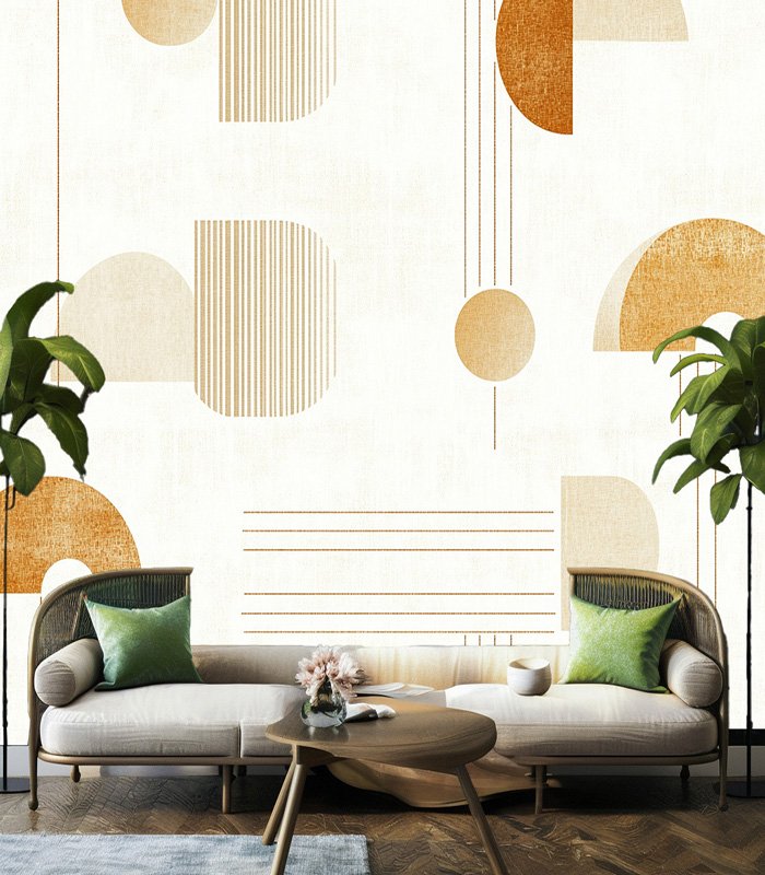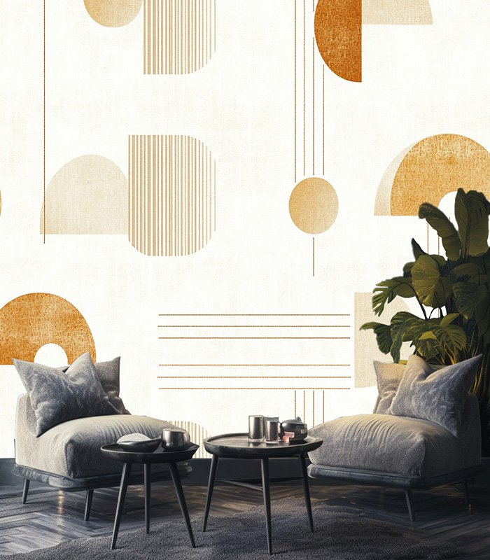 Abstract geometric pattern with semi-circles, lines, and arches in warm earth tones on a textured white background, creating a modern, minimalist design.