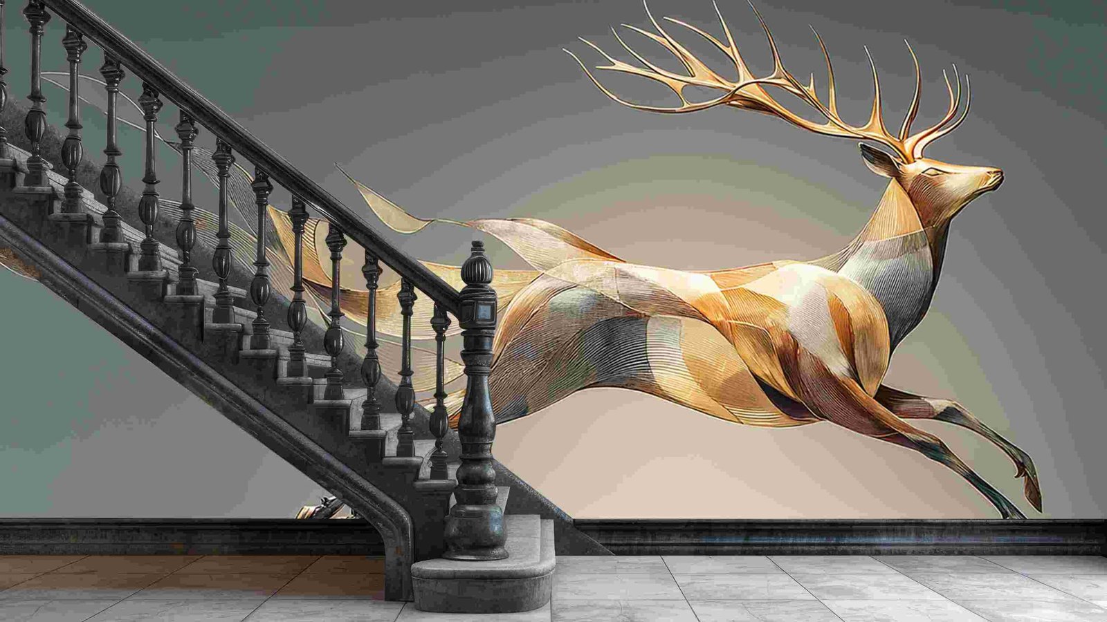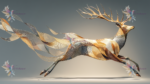 A stylized deer with flowing, ribbon-like elements and intricate antlers, set against a neutral background.