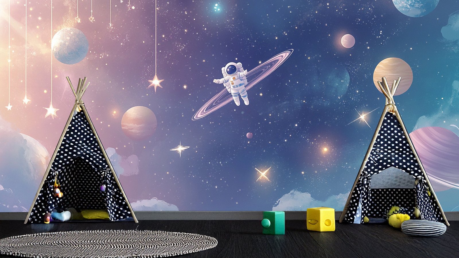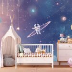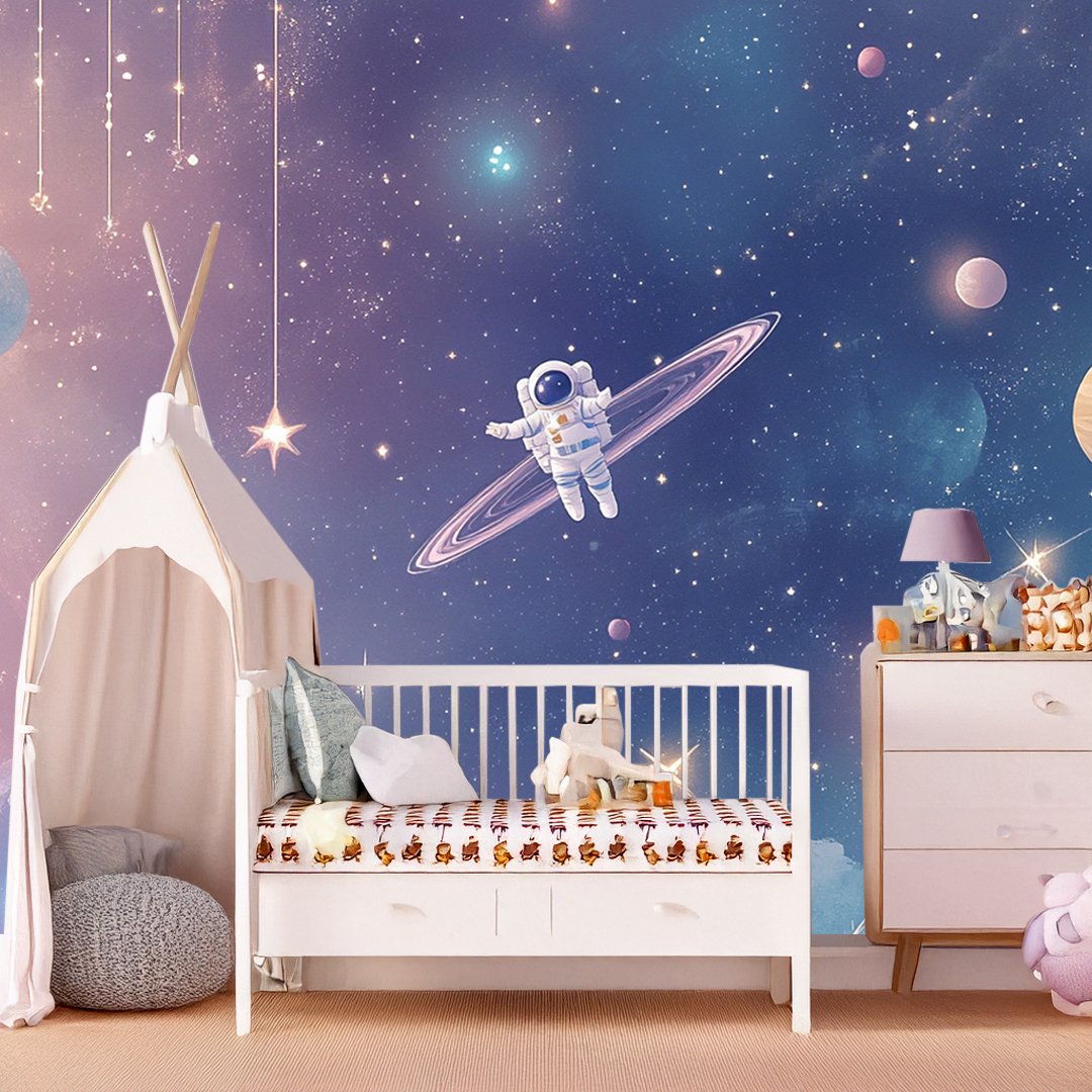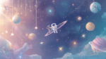 An astronaut floats in a colorful cosmic scene with planets, stars, and swirling clouds.