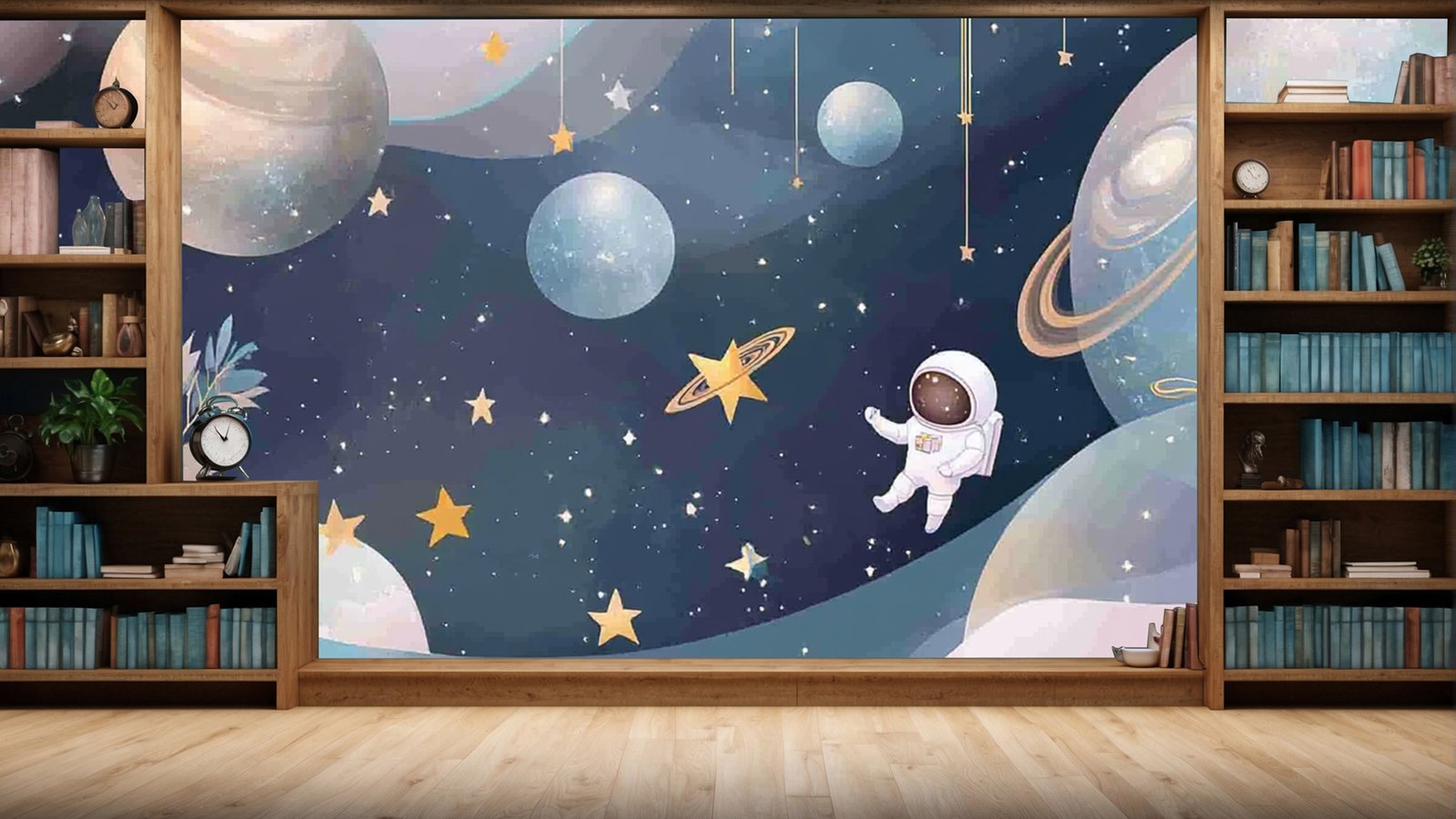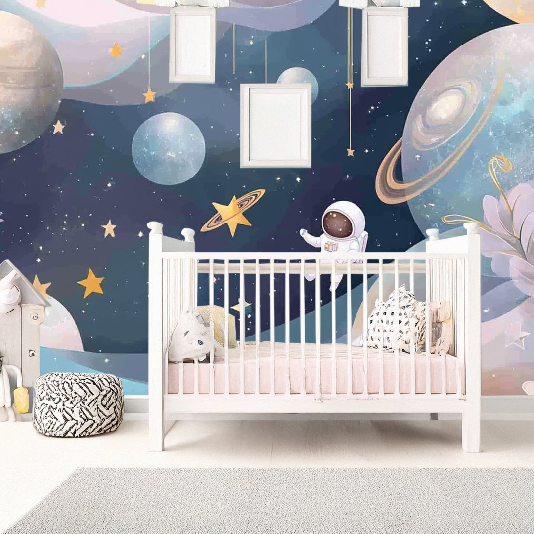 An astronaut floats among colorful planets and stars in a whimsical cosmic scene.