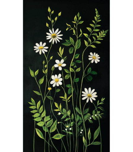 Vintage-style artwork depicting birds in flight among large, textured green leaves and purple flowers, set against a dark, distressed background.