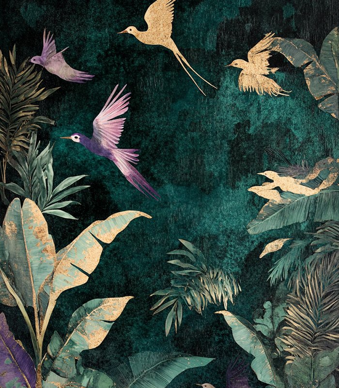 Vintage-style artwork depicting birds in flight among large, textured green leaves and purple flowers, set against a dark, distressed background.