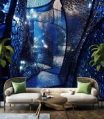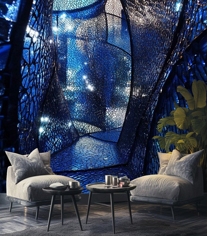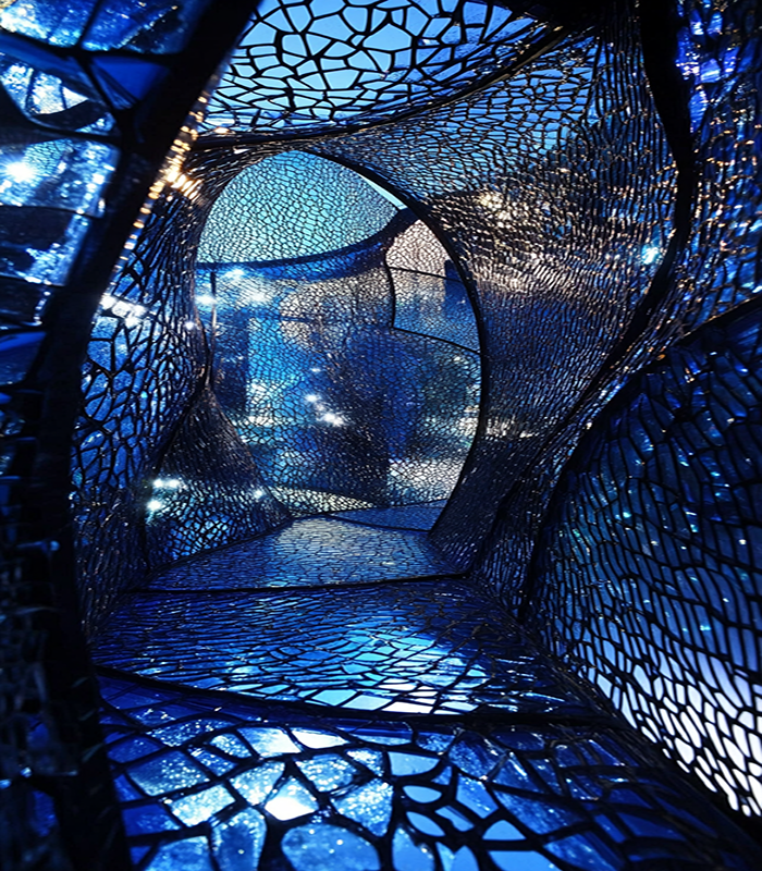 A mesmerizing tunnel of blue stained glass, reflecting light and creating an intricate, dreamlike mosaic pattern that captivates the viewer’s imagination.