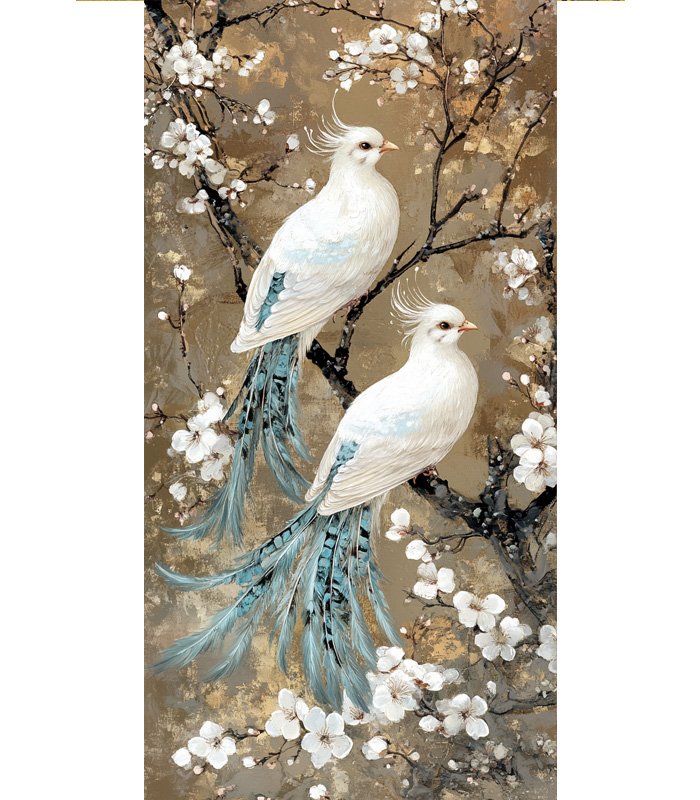 Two elegant white birds with long blue tails perched on blossoming branches, set against a textured, earthy background. A serene and artistic scene.
