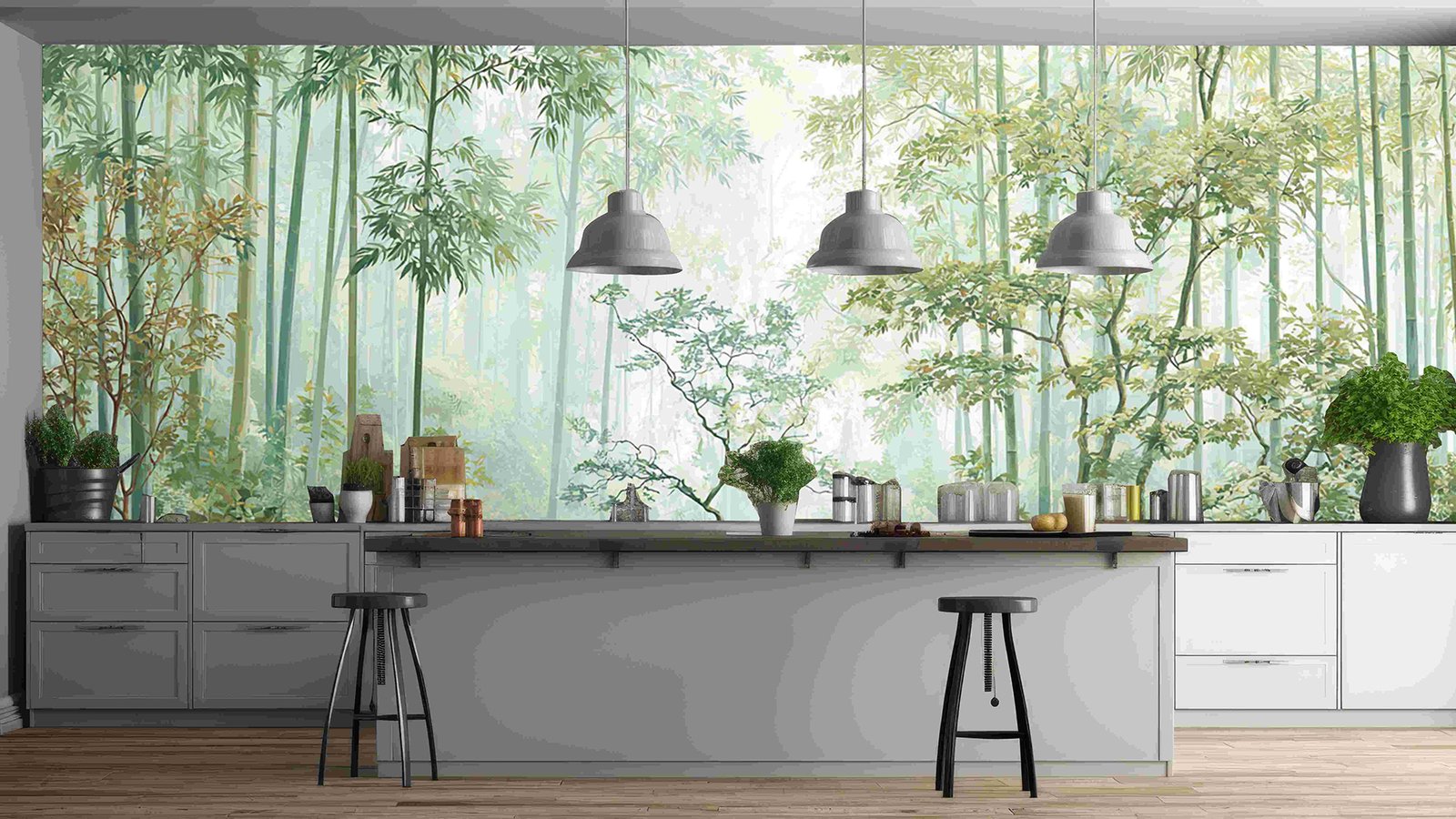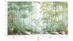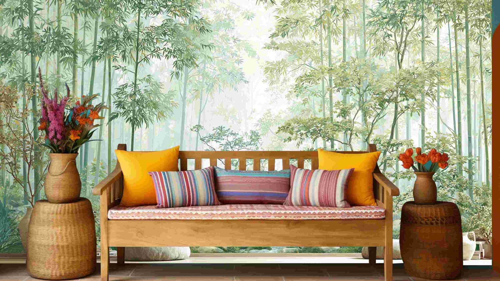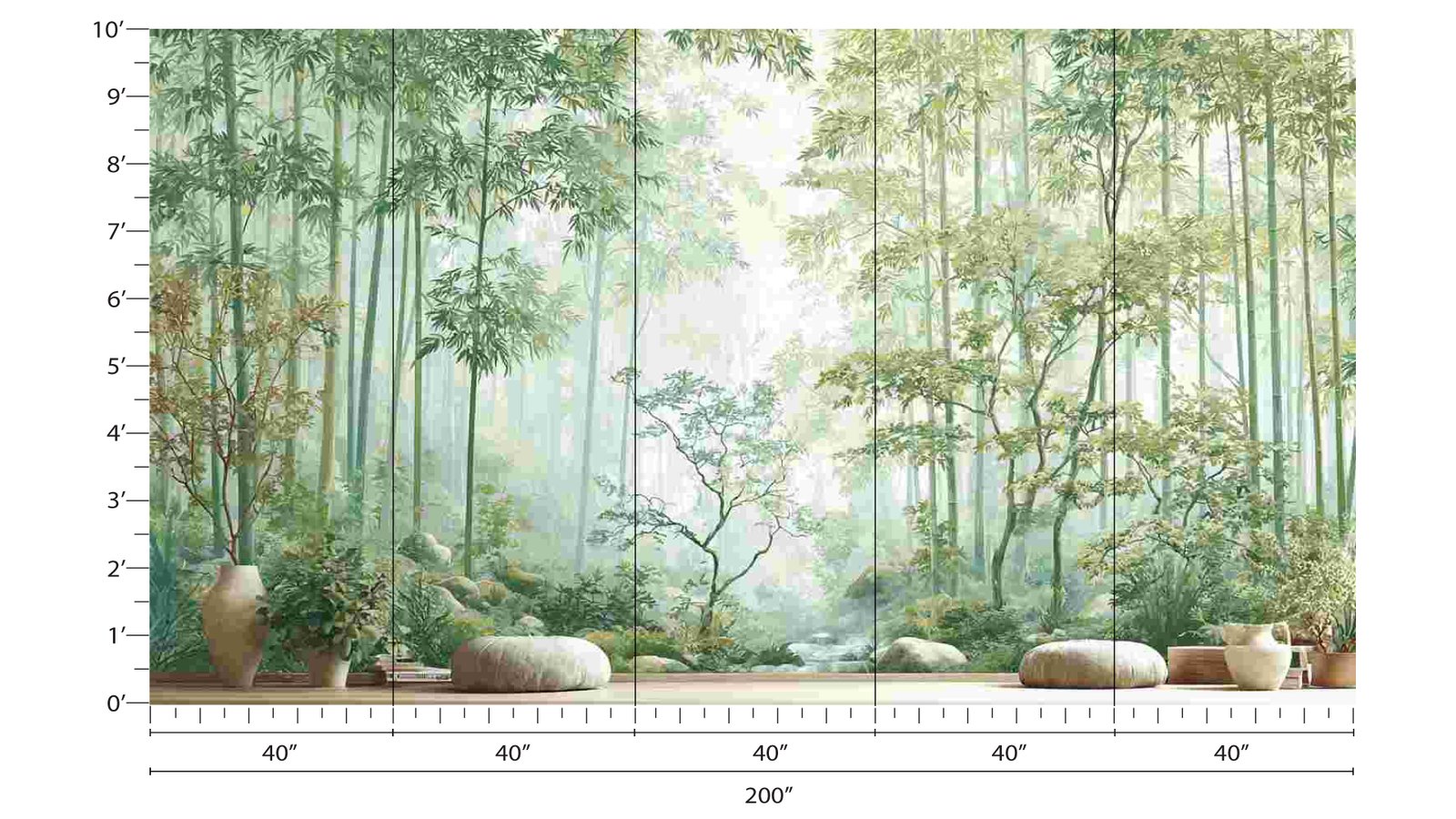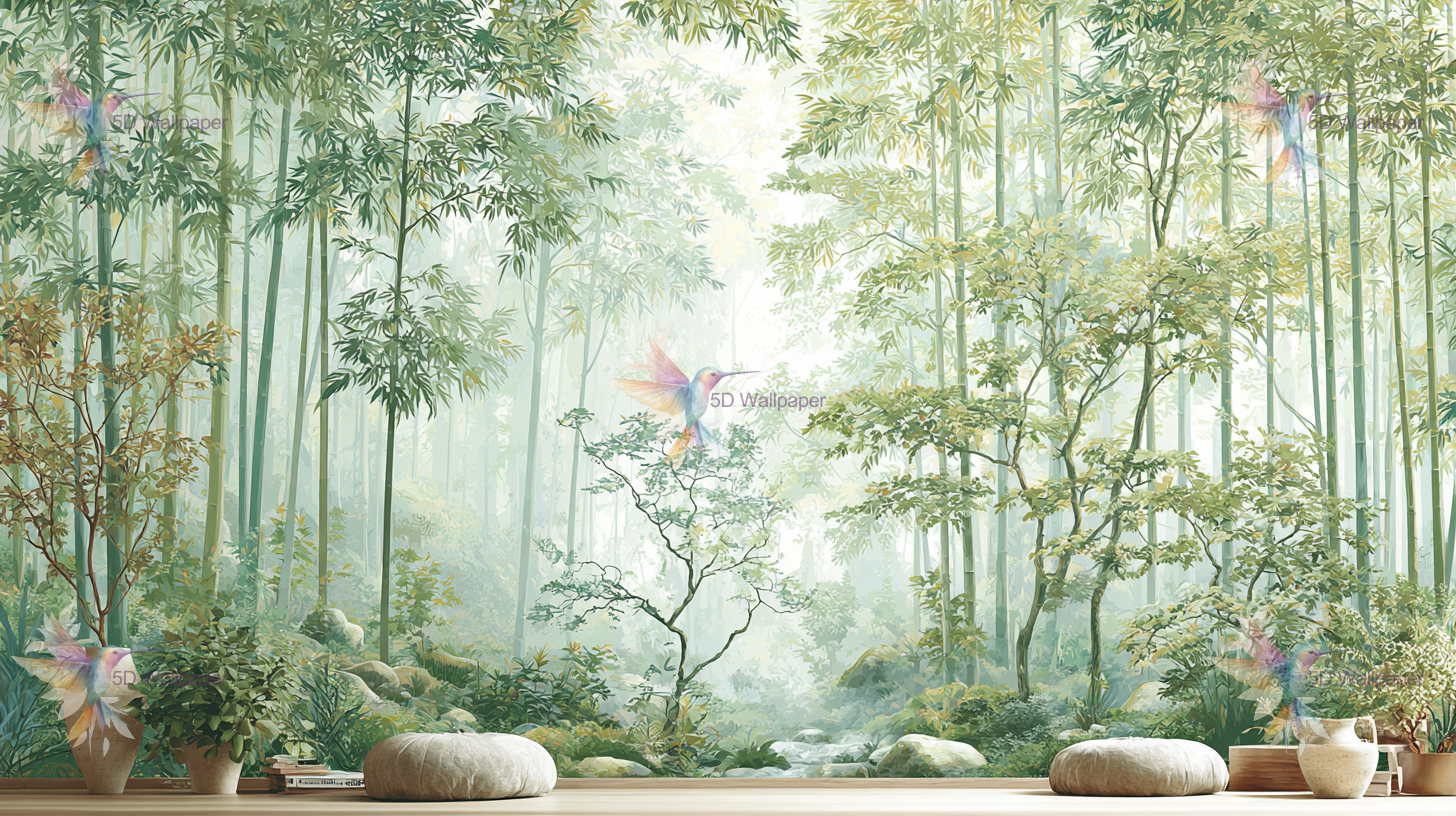 Lush bamboo forest with various green plants and trees, accompanied by decorative vases and cushions.