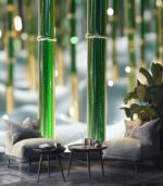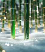 Lush green bamboo stalks rise majestically, their surfaces shimmering with dew under a soft, glowing light in a serene, dreamlike forest setting.