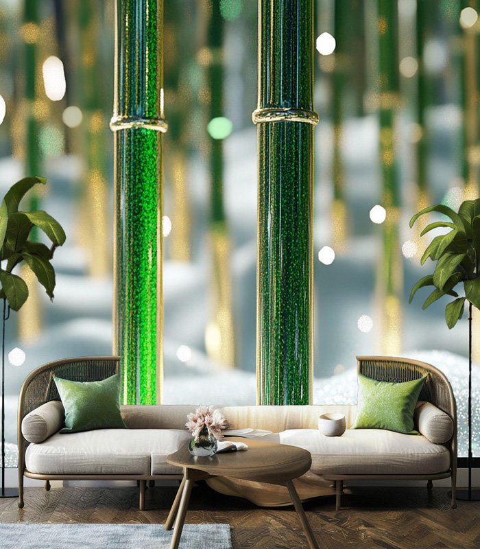 Lush green bamboo stalks rise majestically, their surfaces shimmering with dew under a soft, glowing light in a serene, dreamlike forest setting.