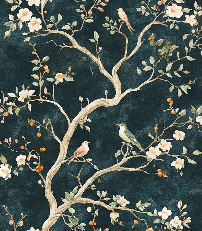 Elegant botanical illustration featuring a white birch tree with delicate flowers and leaves against a rich, textured blue background, conveying a serene, artistic vibe.