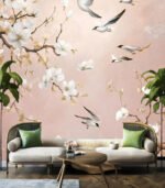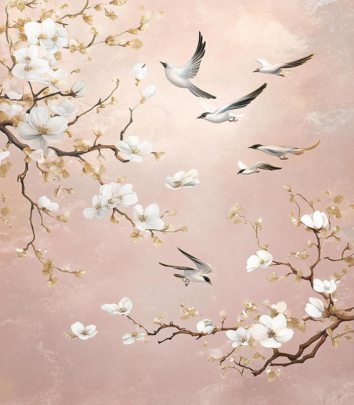 Delicate birds gracefully soar among blooming branches, set against a soft pink background, creating a serene and elegant nature-inspired scene.