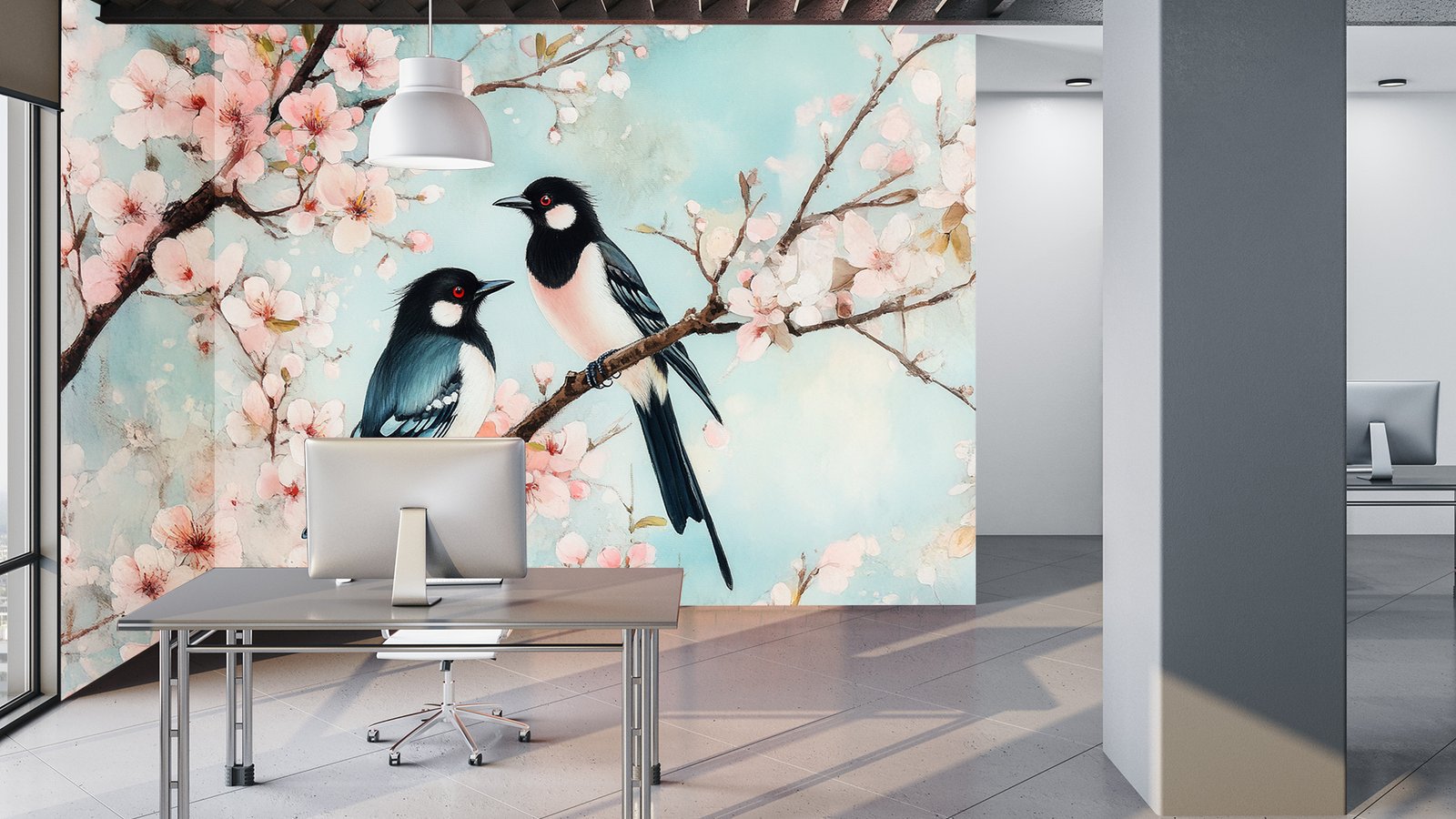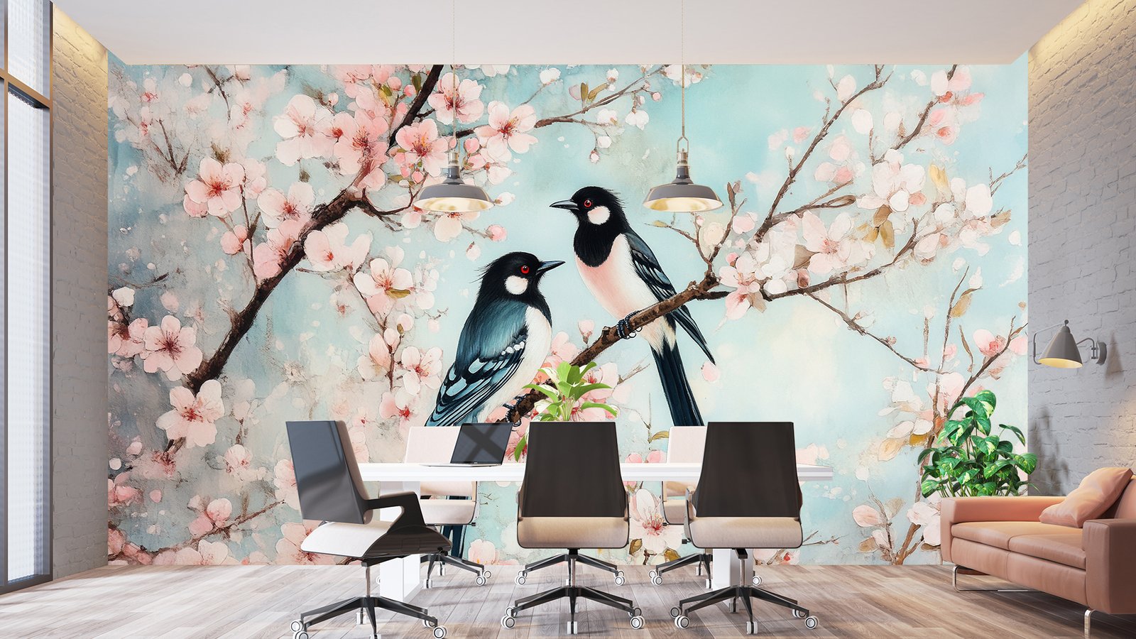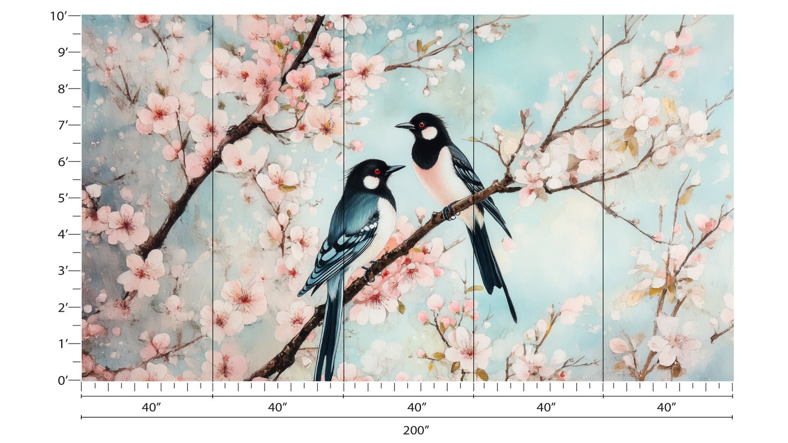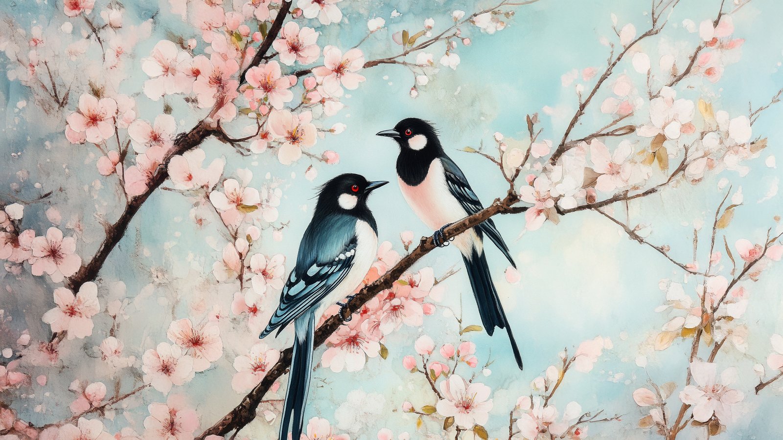 Two colorful birds perched on a branch surrounded by pink cherry blossoms