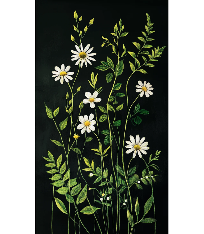 Embroidered artwork depicting a serene nature scene with two white birds in flight above a vibrant floral landscape and a tranquil blue river.