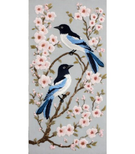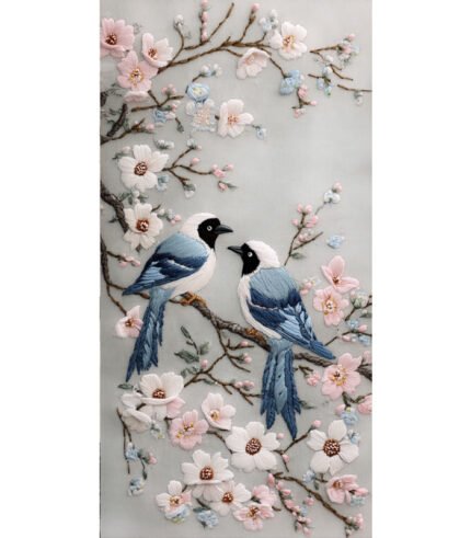 Two blue birds perched on cherry blossom branches, surrounded by delicate flowers, creating a serene and intricate embroidered artwork.