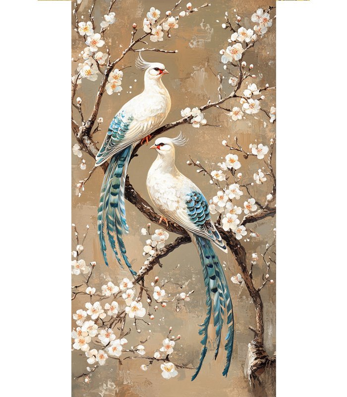 Two elegant birds perched on blossoming branches, surrounded by delicate white flowers, creating a serene and artistic nature scene.