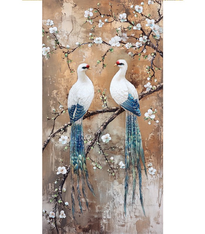 Two elegant white birds with long tails perched on a blossoming branch, set against a textured, earthy background.