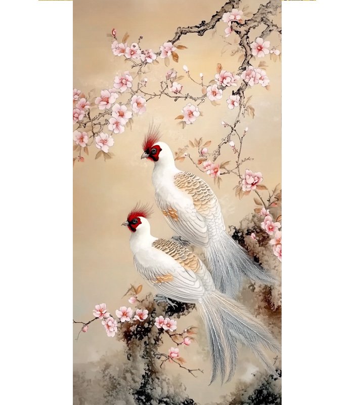 Two elegant birds perched on a branch, surrounded by delicate pink blossoms, create a serene and harmonious nature scene in traditional art style.