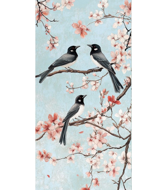 Three birds perched on cherry blossom branches, surrounded by delicate pink flowers against a soft blue sky, creating a serene and picturesque scene.