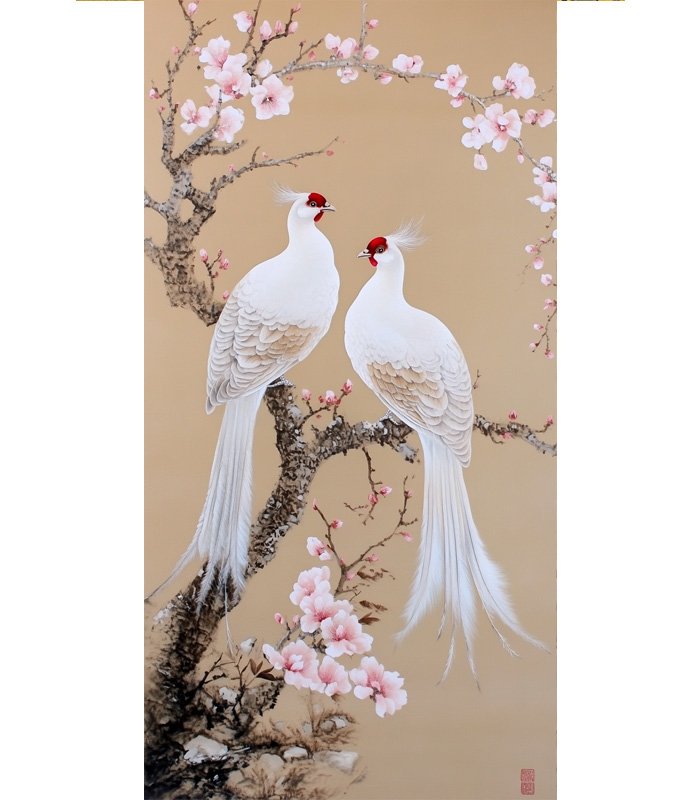 Two elegant white birds perched on a blossoming cherry tree branch, surrounded by delicate pink flowers, creating a serene and harmonious scene.