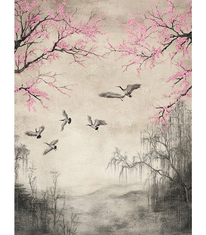 Cranes gracefully soar beneath cherry blossoms in a serene, misty landscape, capturing the essence of tranquility and natural beauty in traditional Asian art.