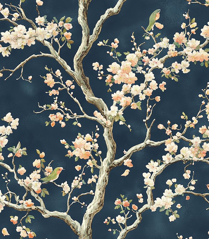 Elegant cherry blossoms bloom on gnarled branches against a deep blue background, accompanied by vibrant birds, creating a serene and traditional Asian-inspired scene.