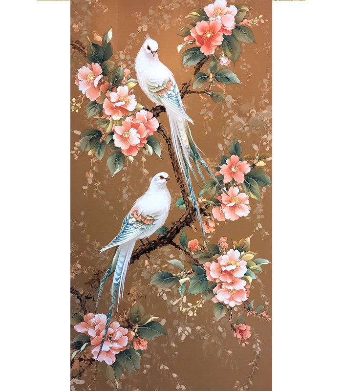 Two elegant white birds perched on a blossoming branch, surrounded by vibrant pink flowers and lush green leaves, against a warm, earthy background.