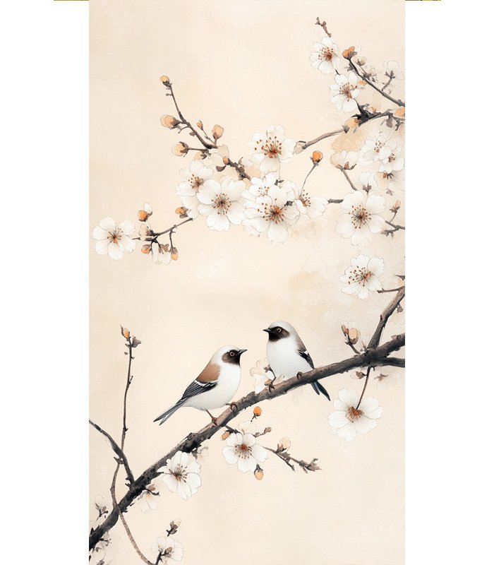 Two birds perched on a blossoming branch, surrounded by delicate white flowers, creating a serene and elegant nature scene in soft tones.