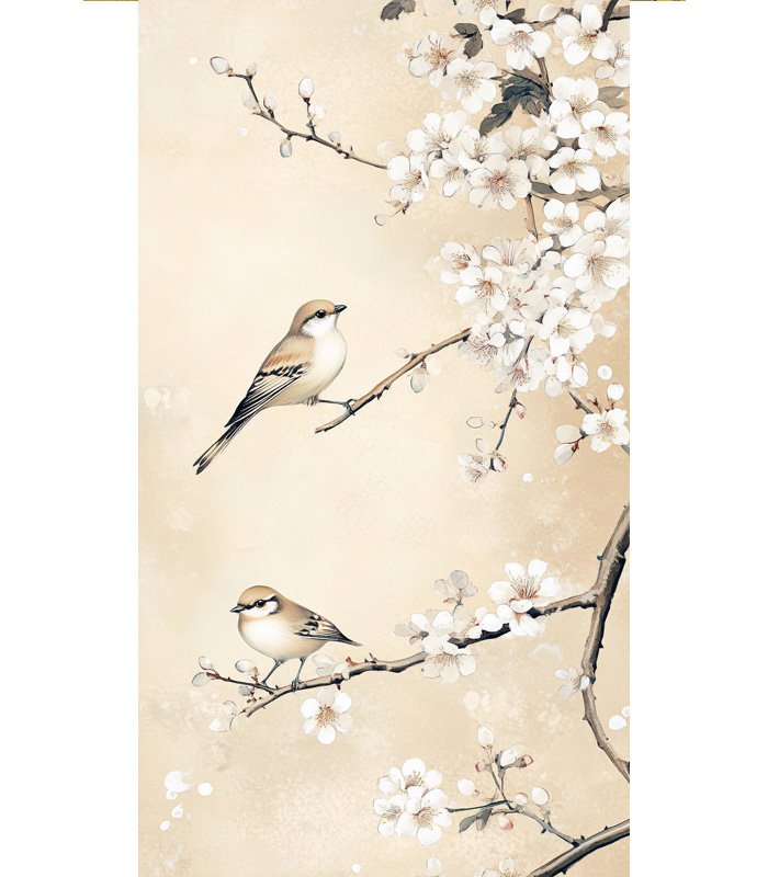 Two birds perched on blossoming branches, surrounded by delicate white flowers, creating a serene and elegant nature scene on a soft beige background.