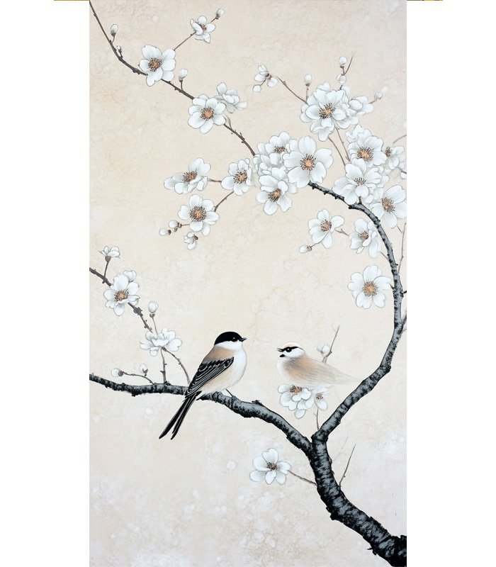 Two birds perched on a blossoming branch, surrounded by delicate white flowers, creating a serene and elegant nature scene.