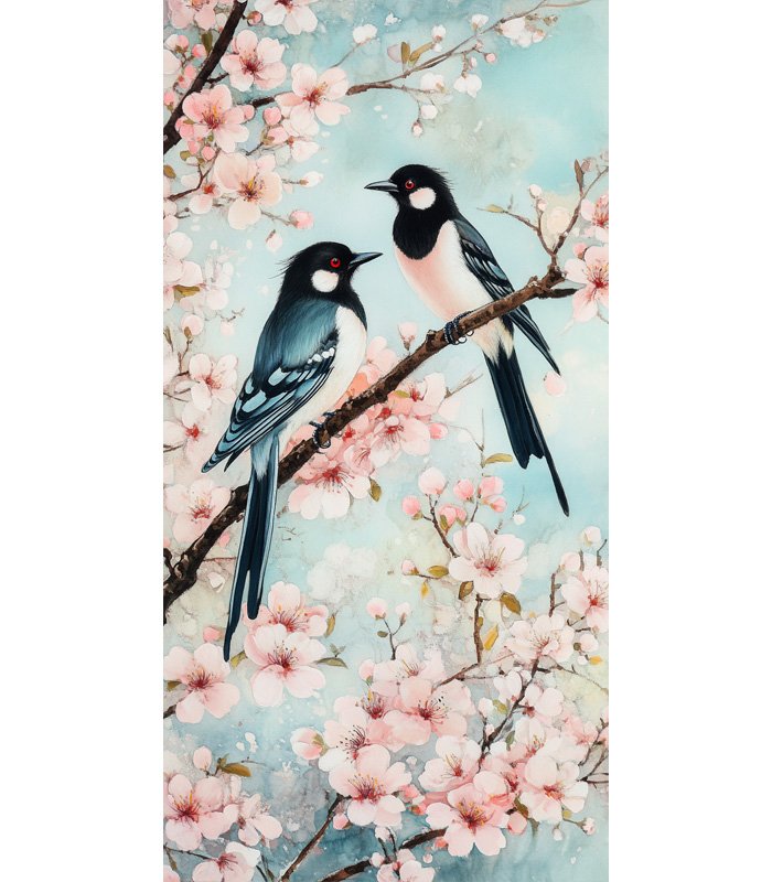 Two birds perched on a cherry blossom branch, surrounded by delicate pink flowers against a soft blue sky, creating a serene spring scene.