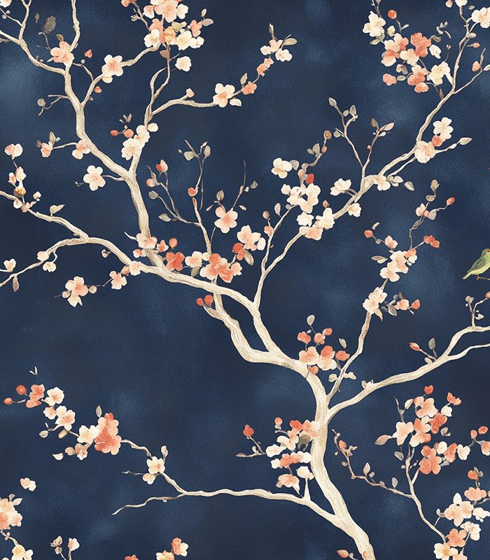 Elegant floral wallpaper design featuring intricate branches of white and peach blossoms on a deep blue background, with a small bird perched subtly.