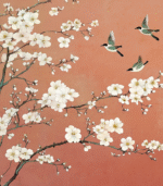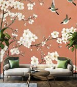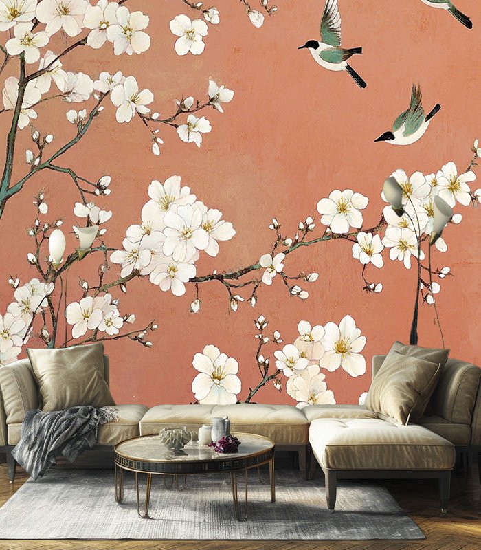 Delicate cherry blossoms and three birds gracefully adorn a warm, peach background, capturing the essence of serene springtime beauty and tranquility.