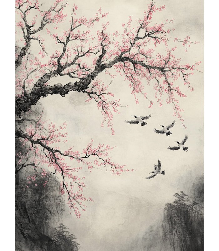 Delicate cherry blossoms adorn a gnarled branch, while birds gracefully soar through misty mountains, capturing the serene beauty of traditional Asian ink painting.