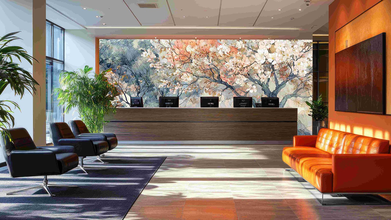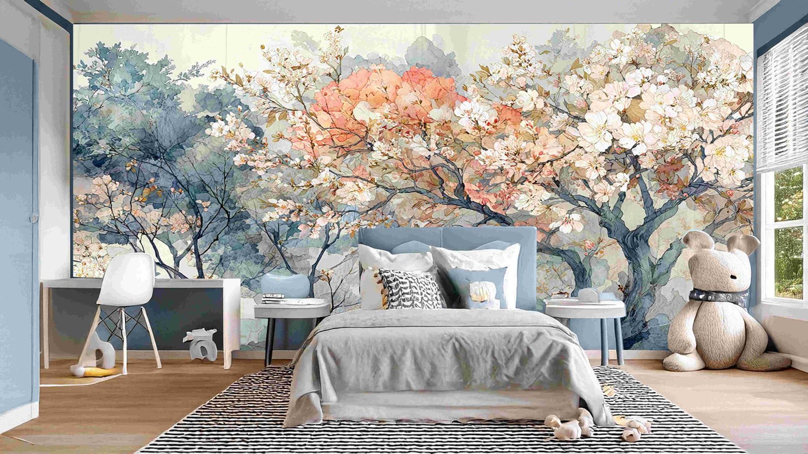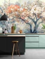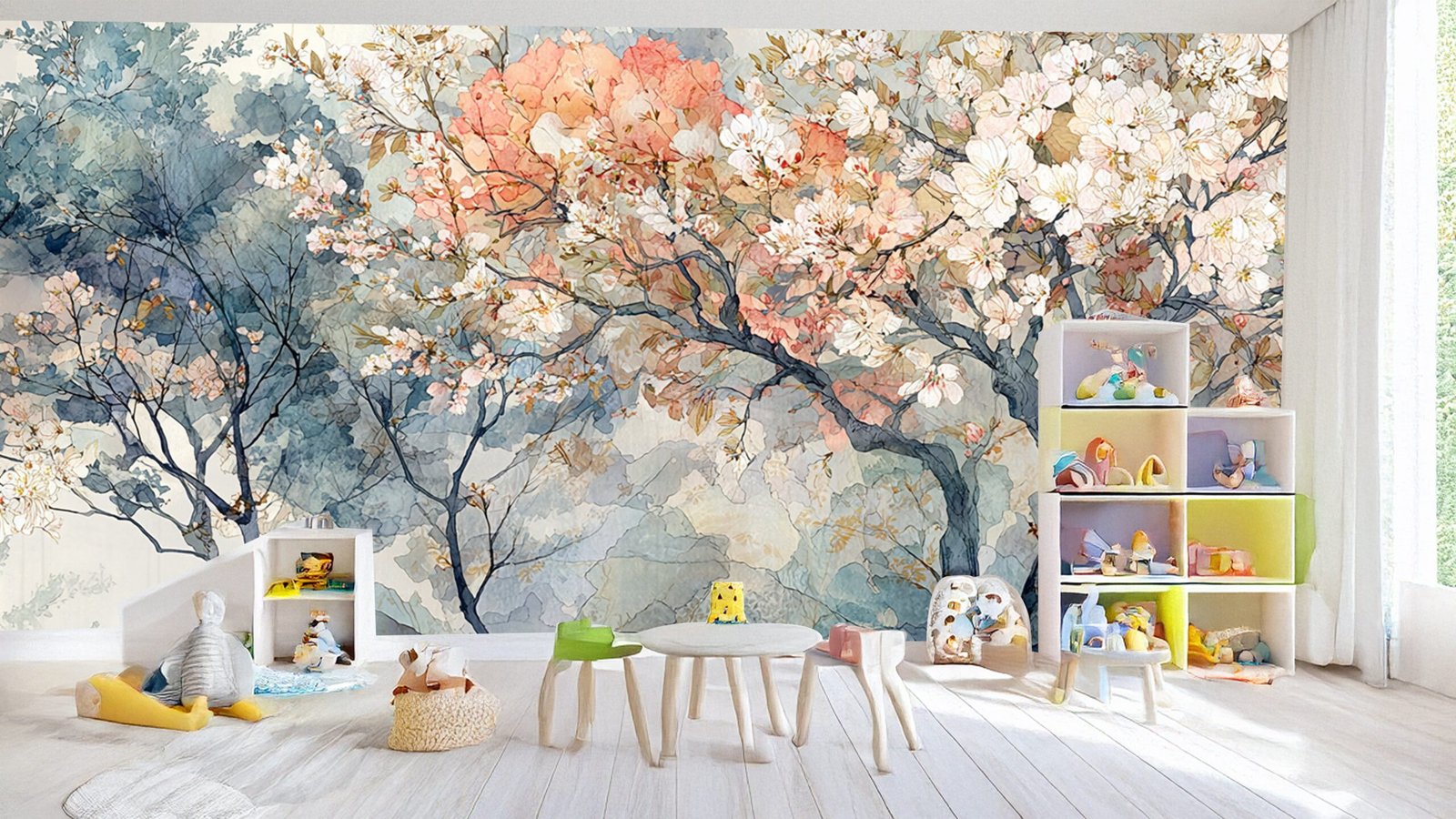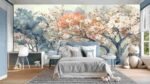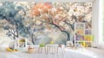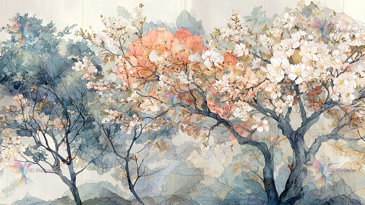 Artistic depiction of trees with pink and white blossoms, set against a soft, watercolor background.