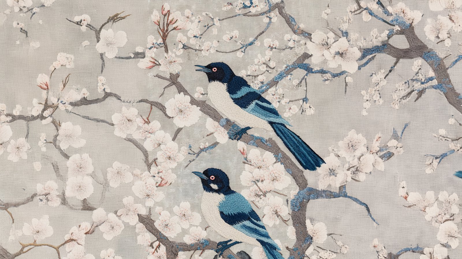 Two blue birds perched on branches with delicate cherry blossoms in a serene setting