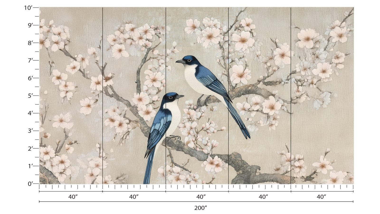 Two blue birds perched on a branch with pink cherry blossoms and textured rock background